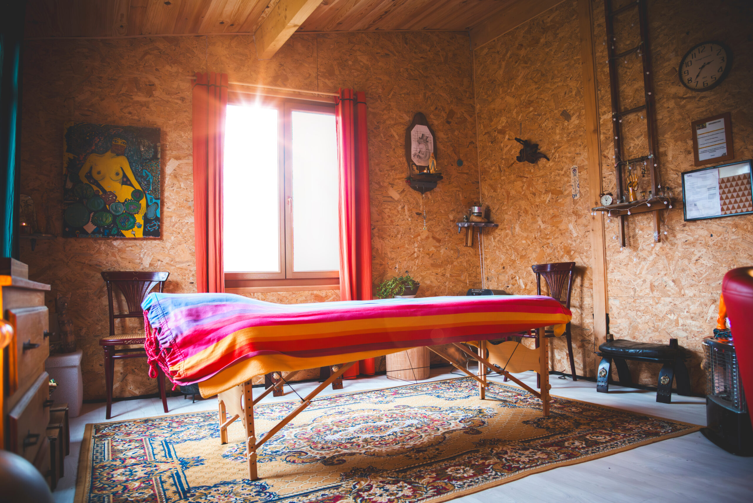 Je vous reçois dans un cocon au cœur de la nature, un lieu à mon image : apaisant, chaleureux et vivant. Ce petit havre de paix est niché dans un coin de verdure, où on y entend le chant des oiseaux et parfois le souffle du vent dans les arbres. À l’intérieur, le bois s'entremêlent de lumières douces créant une atmosphère enveloppante. Un fauteuil confortable vous attend pour échanger, une table de repos invite à s’allonger et à se relâcher. Le lieu est simple, mais pensé avec le cœur : il y a tout à disposition ! Des plaids pour plus de confort et tout le calme nécessaire pour se recentrer. Le chalet devient, le temps d’un soin, une bulle suspendue hors du rythme du quotidien : un espace pour se reconnecter à soi.